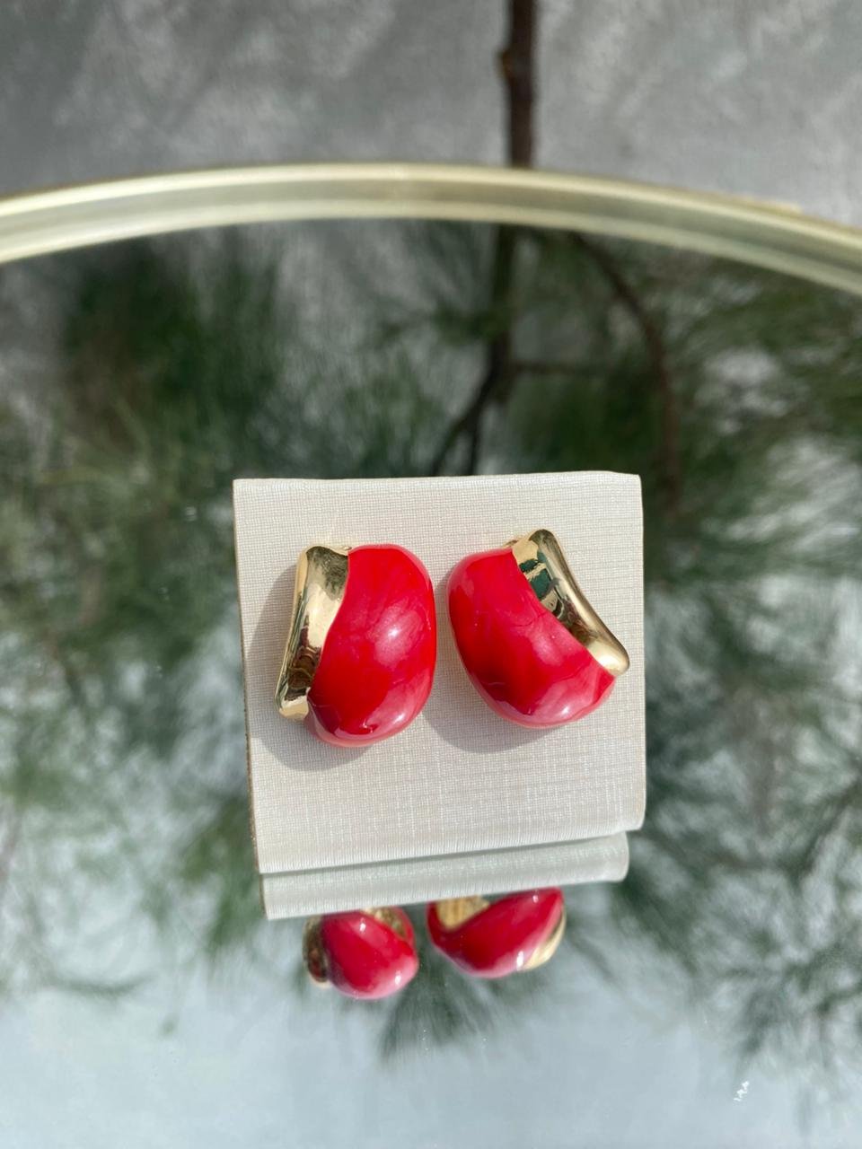 Brinco modelo argola bold com design orgânico e acabamento dourado, combinado com detalhe em resina vermelha intensa que traz modernidade e personalidade à peça. Ideal para quem ama acessórios marcantes e cheios de estilo, perfeitos para elevar qualquer produção.