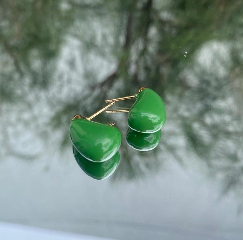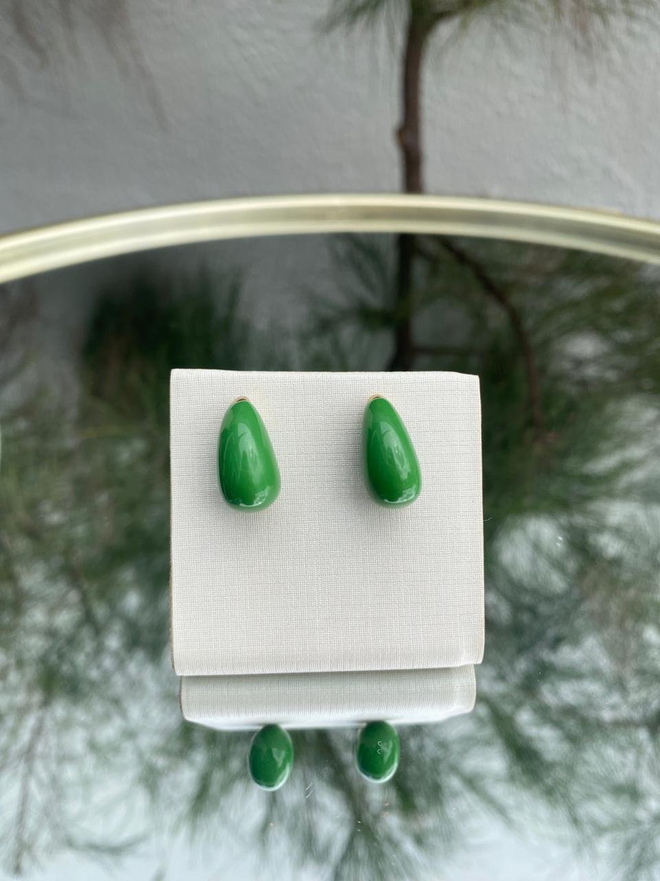 Brinco em formato de gota com acabamento liso e tom verde vibrante, trazendo frescor e elegância à composição. Um acessório moderno e cheio de estilo.