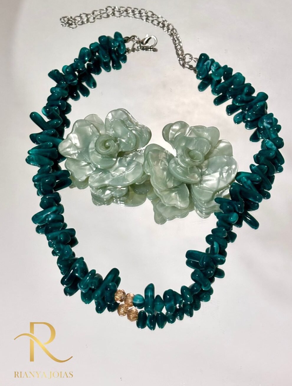 Conjunto artesanal composto por colar com contas em tom verde esmeralda e brincos em formato de flor com acabamento perolado. Uma combinação marcante e feminina, que traz charme e personalidade ao visual. Ideal para quem busca acessórios diferenciados, com inspiração na natureza e destaque único.