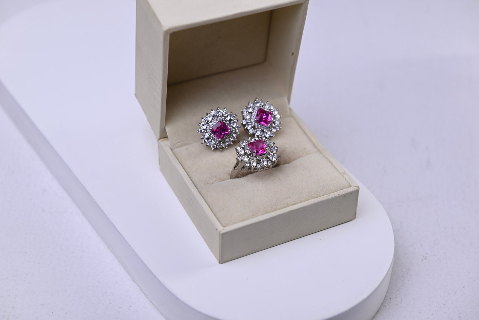 Conjunto composto por brinco e anel com cravação princesa, destacando a beleza da pedra pink em lapidação quadrada, que traz delicadeza e feminilidade ao visual.
