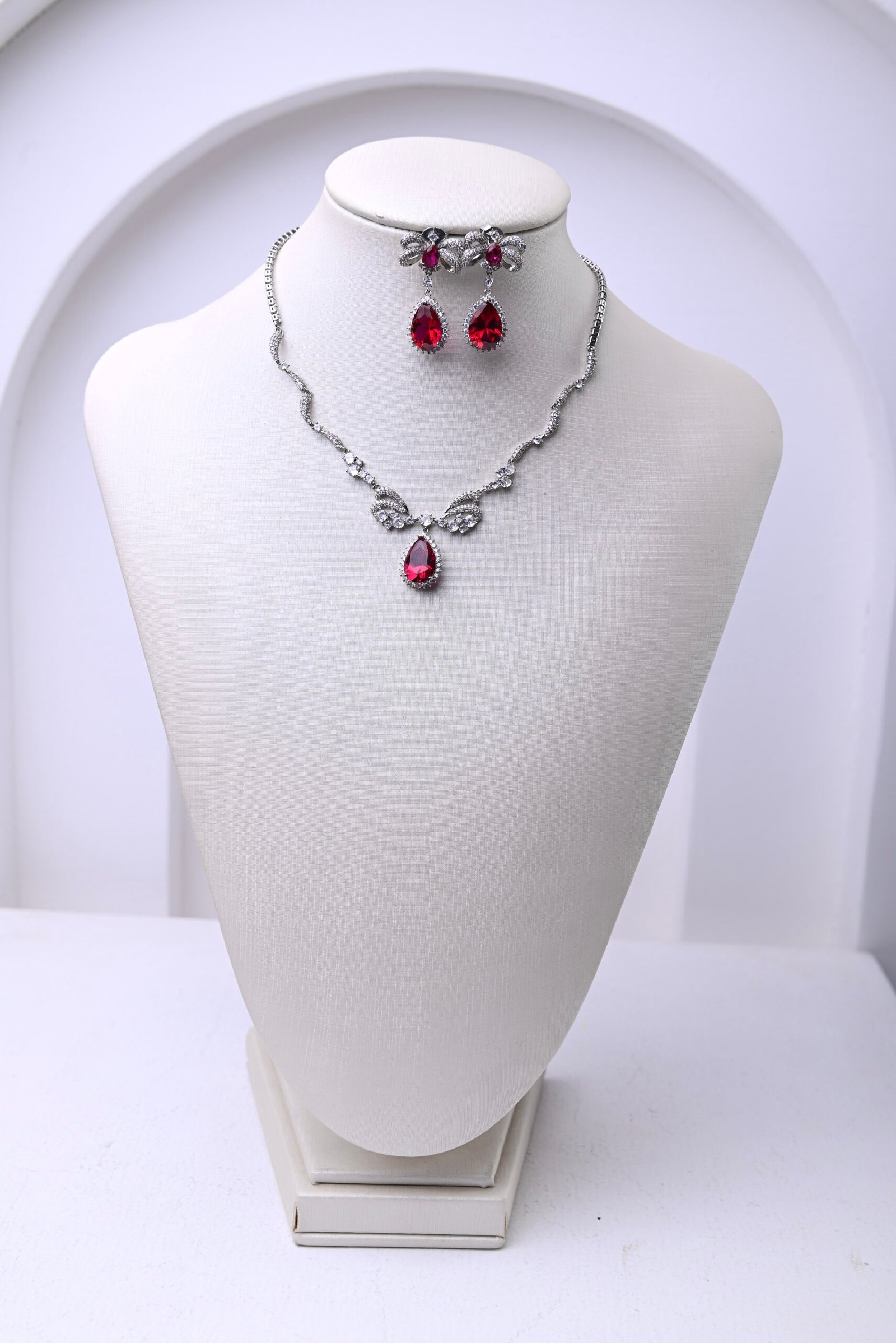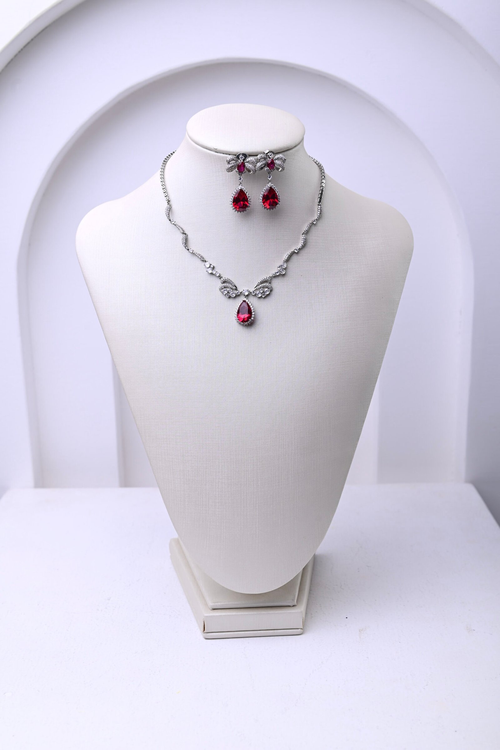 Conjunto elegante composto por colar e brinco, com pedra em formato gota na cor vermelho rubi, que simboliza sofisticação, intensidade e feminilidade.