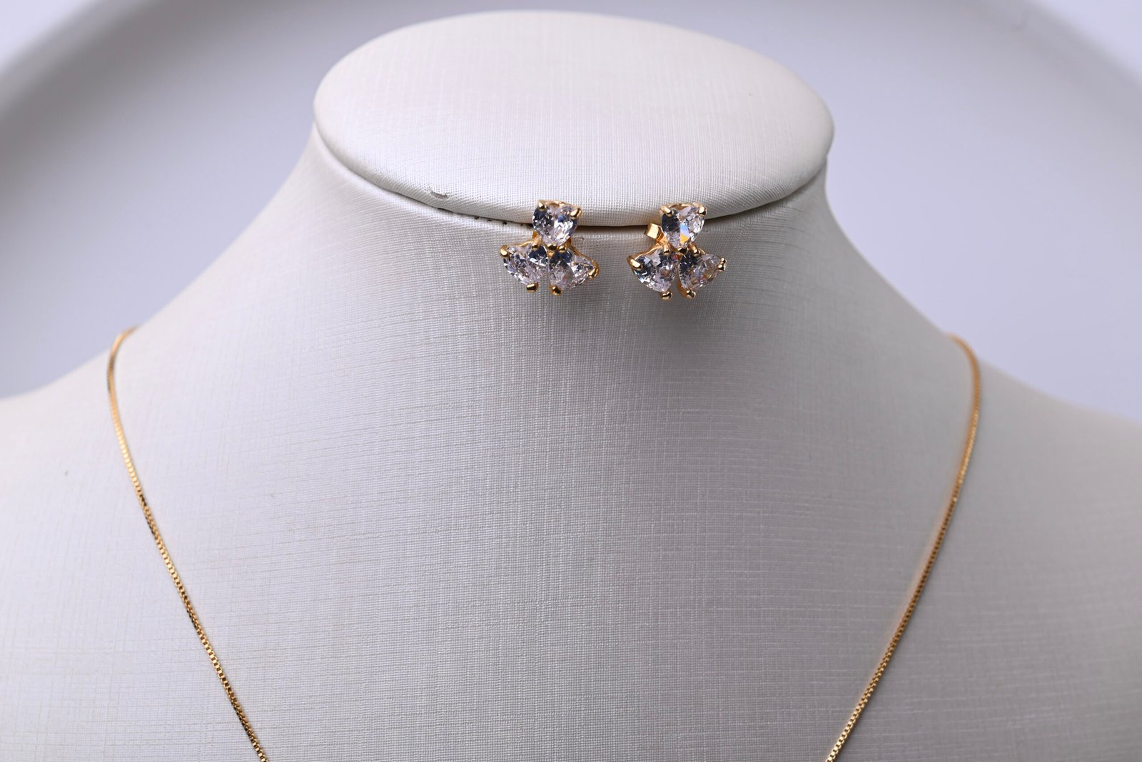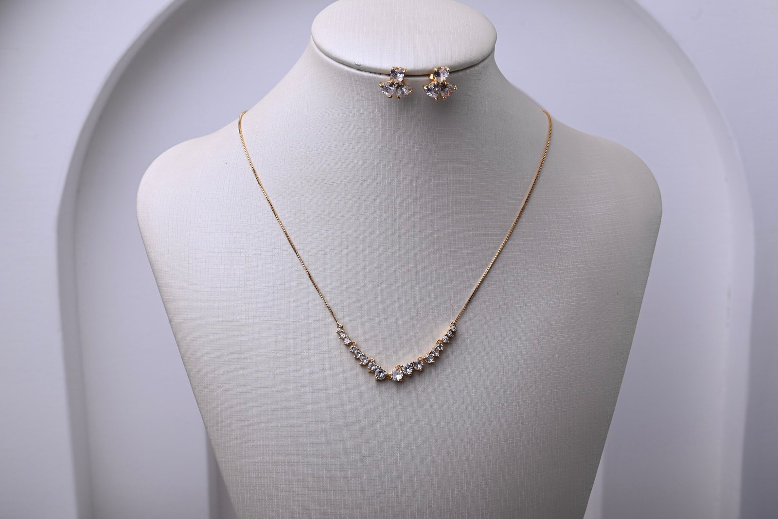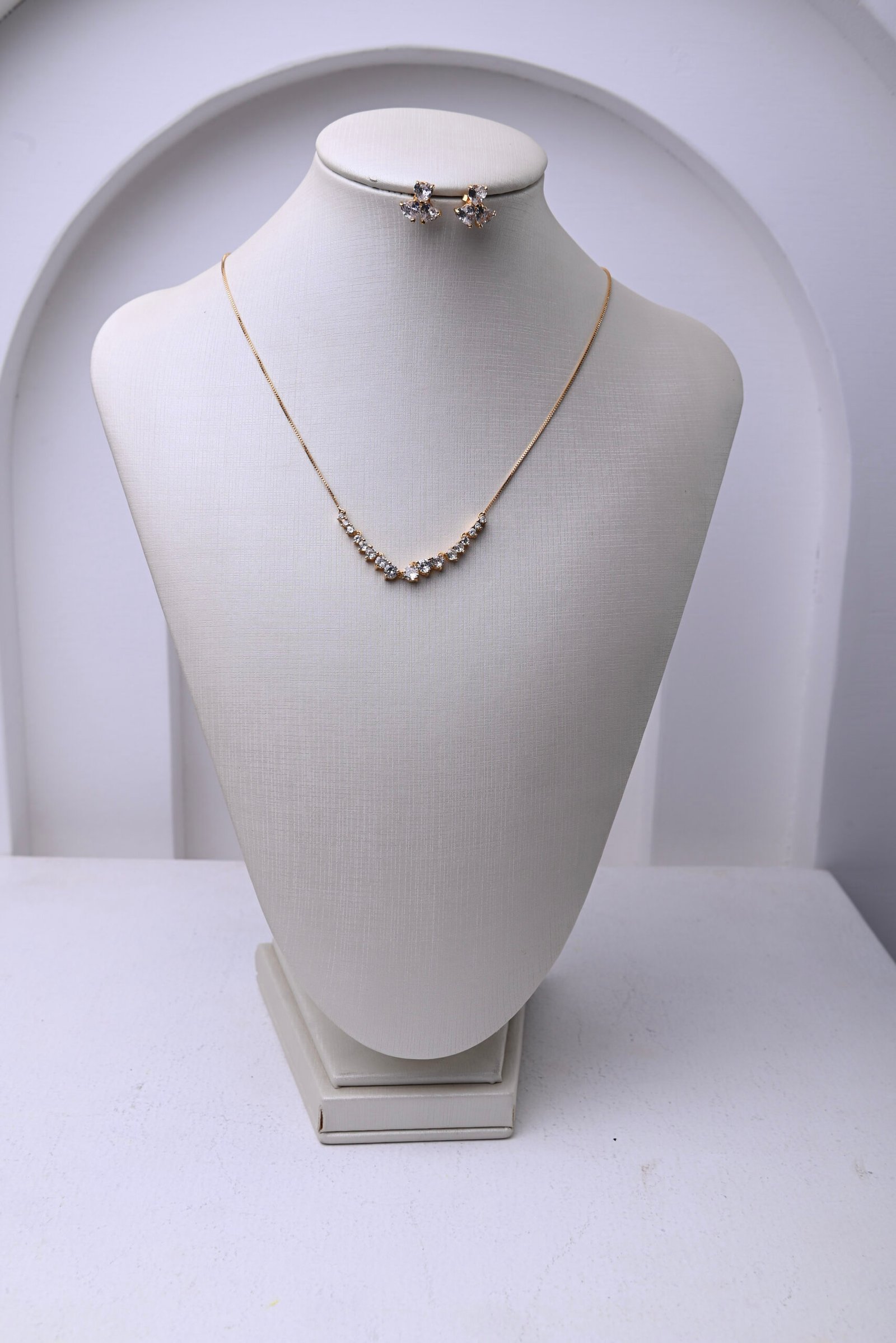 Conjunto elegante com colar modelo meia riviera em zircônias cristal e brincos delicados combinando. O design clássico garante um visual sofisticado e atemporal, perfeito para eventos formais e celebrações.