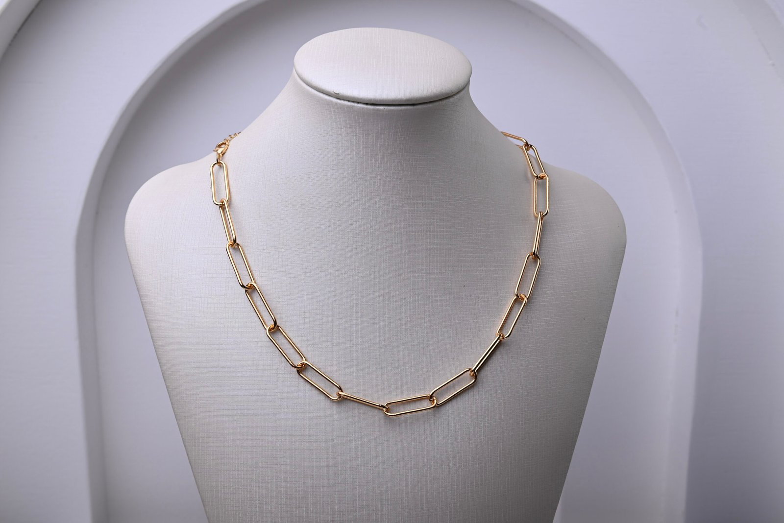 Correntede elos alongados estilo “paperclip”, com acabamento polido e visual contemporâneo. Uma peça versátil que transita facilmente do casual ao sofisticado.